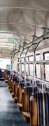 | The interior of C.M.B.C. MCI Classic Suburban #B4149, while at the Burnaby Transit Centre on July 7, 2002. What made them suburban was the upholstered seats and reading lights. In addition, all BC Transit MCI's all had rear doors, however the suburbans had a single width exit door versus the double width exit doors the transit configuration buses had. (Photo by Peter McLaughlin from his website www.busdrawings.com. Used with permission.) |