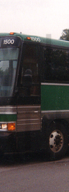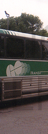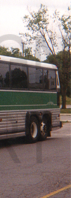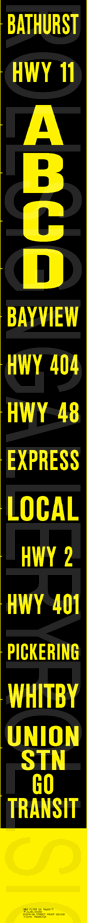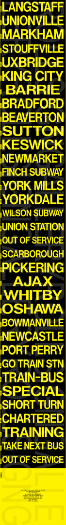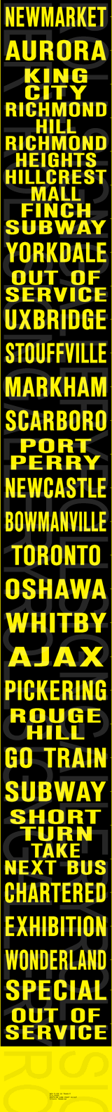 | Unlike the other GO Transit sign sets, this special one piece sign was designed specifically for GO Transit's second hand MCI 102A3 and 102C3 buses that originally ran for Woodlands Express in California and Antelope Bus Lines in California respectfully. These second hand coaches did not have the split destination sign fixture like the rest of the fleet. This sign is dated November 10, 1998 and has 55 exposures, 13 fewer than the front signs for original GO Transit buses. Some of the short turn destinations and most of the destinations that applied to the local routes "Yonge C" and "Bayview" were left off this rollsign. Its sign tag and a photo of one of the buses that used these special rollsigns is shown below. |