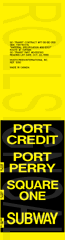 | This set of mylar rollsigns was designed for one of their 1977 GMC T8H-5307A New Looks. These "yellow print" signs are what replaced the colour signs. Both signs were received in "uncirculated" condition having never been installed in a bus. The destination sign has 68 exposures, while the "via" sign has 51 exposures. Both signs are dated October 22, 1998. Their use in service was short lived, as the GMC buses they were designed for were retired from service in April of 2000. Their respecitve sign tags are shown below. |