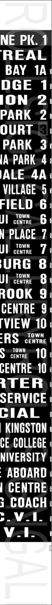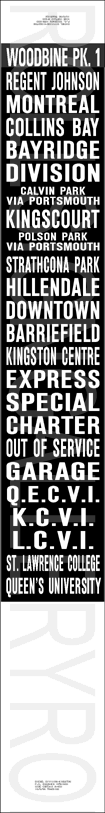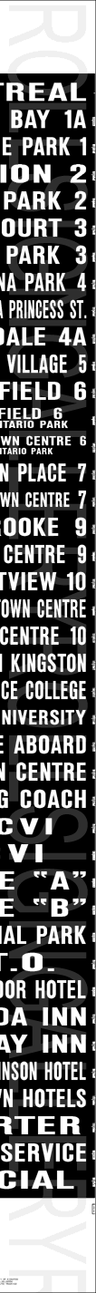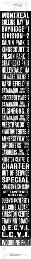 | This mylar front route sign is off of 1981 built GMC T6H-5307N #8177. It is dated January 3, 1992 and has 41 exposures. This all-original print sign featured the most updated routes and destinations until the introduction of the colour signs. |