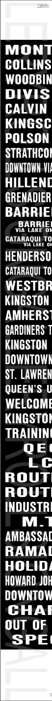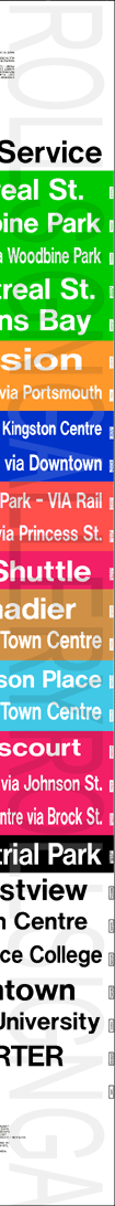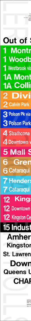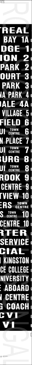 | This mylar front route sign was designed for a GMC or MCI TC40-102N "Classic". It is dated August 23, 2001, and has 27 exposures. The colours on the rollsign correspond to the route colours on their printed system map at this time. |
