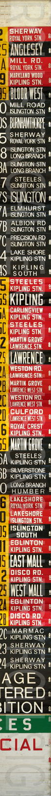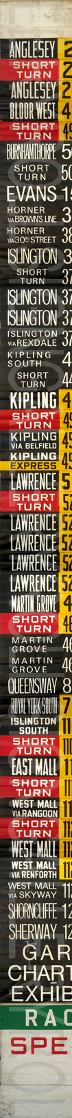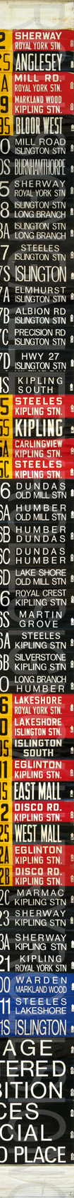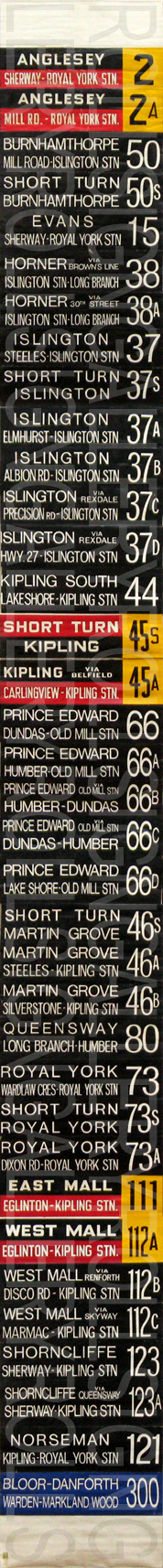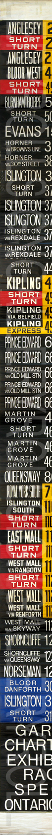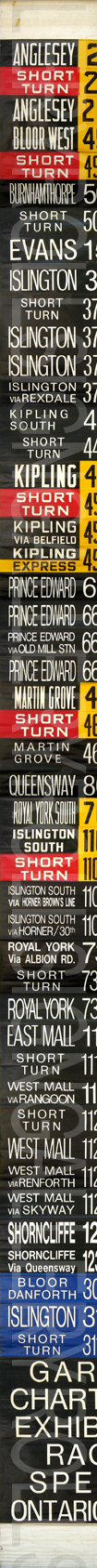 | This front linen rollsign has 49 exposures. Through research, it was found that this version was created around June 24, 1984. It is shown on the sign to be version "Q-38". The most notable point about this sign is that there is no blue "Blue Night" exposures. Exposures that are red, yellow and black are the original design. As well, the "Races" and "Special" are from the milticolour era of rollsigns. From 1985 on, the TTC used only black for regular service routes to save money. |