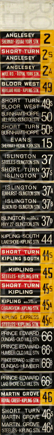 | This front linen rollsign has 53 exposures. Through research, it was found that this version was created around February 5, 1989. It is shown on the sign to be version "Q-45". The "44 Kipling South" exposure was unintentionally cropped from the sign by the TTC. |