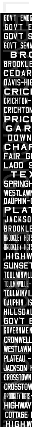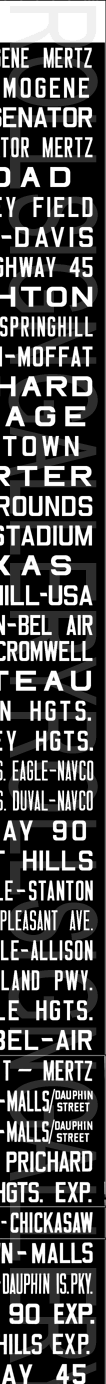 | This partial front rollsign has no print date, but would have been originally printed sometime before 1985. The first 34 exposures (up to the "GOV'T BEL-AIR" exposure) are original to the sign. The remaining ones were later additions, either painted on after to tacked in. This rollsign has 45 exposures total. |