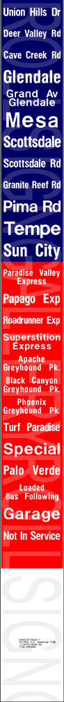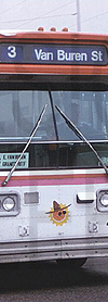 | Phoenix Transit System's 1975 built AM General #4770, the type of bus that would have housed this rollsign set, is seen southbound on 1st Street crossing East Washington Street in February of 1980. (Photo from the Bob Redden archives, courtesy of the website Rapid Transit Press, http://www.rapidtransit-press.com. Used with permission.) |