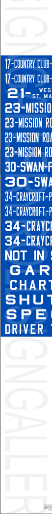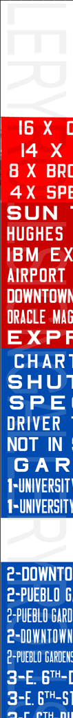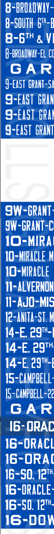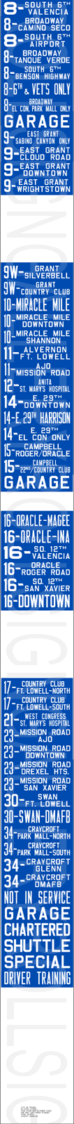 | These two mylar rollsigns are a set. According to the sign tag, the front rollsign (left) was designed for their GM New Look, Flxible New Look and AM General buses. The sign has no print date, but has the same original exposures as the side sign shown. The first four exposures and the "16 ORACLE - TUCSON MALL" exposures were hand painted and added at a later time. The sign has 119 exposures, including the blank areas. According to the sign tag, the side sign (right) was designed for their AM General buses equipped with motorized side sign boxes. It is dated April 29, 1981 and has 115 exposures including the blank areas. Their respective sign tags are shown below. These two rollsigns were donated to Rollsign Gallery from the late John McDonnell through his will. |