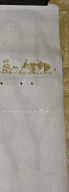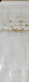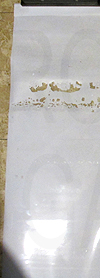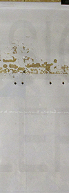 | The side rollsign (right) appears to have been left on the beginning blank for an extremely long time without being rolled. The mylar's exposure to the sun and the elements degraded the scroll at that point. (see above). The white background coating separated from the mylar core and has been flaking away badly. The clear mylar core had also weakened to the point that it had started to tear, and one small section within that area had actually broken off. The original beginning blank to the first exposure was 32 3/4 inches long. To preserve the quality and integrity of the sign, the beginning blank was trimmed back to 21 inches long to remove the damaged and weakened area of the scroll. The rollsign image here was drawn to show its prior full length as it was originally designed. |