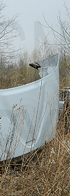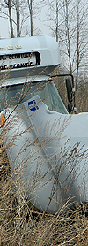 | Retired Wayne Area Transportation Services Ltd. 2003 built International 3200 bus #321, the bus shown still displaying this front rollsign, is seen as discoverd at a scrap yard inwestern New York on April 17, 2019. (Photo by Peter Huffman. Used with permission.) |