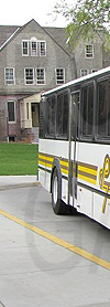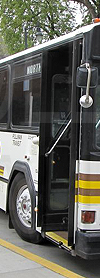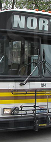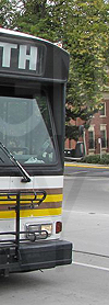 | Pullman Transit 1985 built Gillig Phantom #104, the type of bus that would have held this sign, is seen at the Washington State University bus stop outside the Chinook Student Center, Northeast Thatuna Street at Northeast Campus Street far side, on August 28, 2010. Photograph by Zach Willhoite. Shared to honor his memory. |