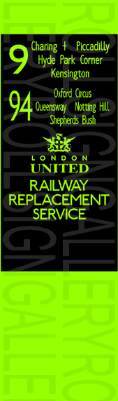 | These two "Dayglo" Tyvek bus signs are from London United Busways, a service operating out of Shepherd's Bush garage in west London. London United was a privatised company that was formed after the break up of London Transport/London Buses. In 1996, it was sold to a French company called "Transdev" and continued to provide service to this date. |