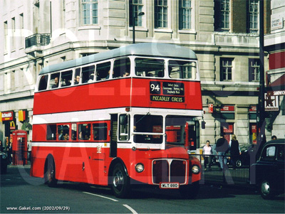 | WLT-880 (RML-880) London United Routemaster is seen on Route 94, Sept. 29, 2002. The destinations on the sign in the picture are the same as the second exposure on each sign. The "PP" sign (above/right) is located under the second deck overhang, above the left side headlight. The "LL" sign (right) is above the side/rear entrance. (Photo courtesy of the website: www.gakei.com) |