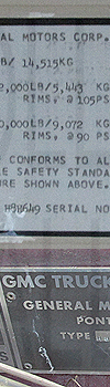 | Above; Retired Mid-America Bus Company June 24, 1980 built GMC H8H-649 (Serial #A231) parlor coach #428, formerly Central West Motor Stages, Inc. #428, and the bus this rollsign was removed from, is seen as it was discovered at a Chiago, Illinois area scrap yard on November 14, 2023. Below: The VIN sticker and plate on bus #428. |