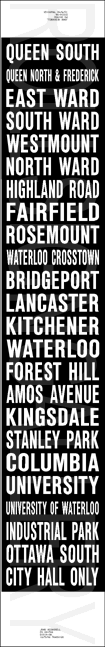 | This mylar side route sign is a replica of an original Kitchener (Ontario) Public Utilities Commission linen side rollsign he used to own. The original rollsign was from 1969 built GMDD T6H-5305 "New Look" #691. The original rollsign was damaged by water. This rollsign's tag is shown below. |