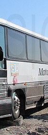| Retired Americoach "Motor Coach Inc." MCI 102A3 #360 which was formerly Prigge's Discovery Coach #127, and still displaying the rollsign shown here, is seen at a scrap yard in south Chicago, Illinois on March 28, 2013. This bus has since been scrapped. |