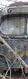 Retired U.S. Air Force mid-1940s built ACF Brill C-44 #48B 142, the bus these rollsign segments came from, is seen in a scrap yard in northwest Wisconsin on November 27, 2021.