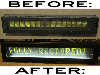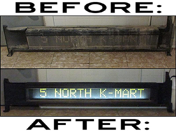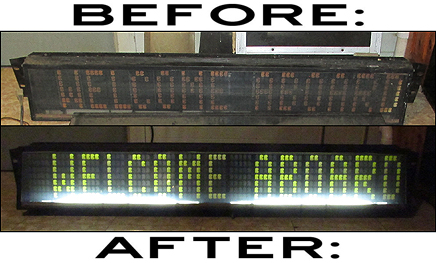 All the equipment for sale in this section, unless otherwise stated, are second-hand used items. All items sold have been pre-tested, and do work as designed, prior to shipment. On the right, some examples of the quality electronic sign restorations I perform: What the signs look like when I get them, then how they look after refurbishment ►