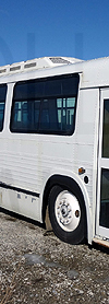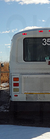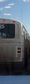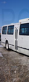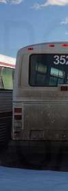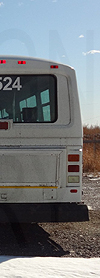 | Above, Fort McMurray Transit MCI TC40102A "Classic" #3525 (ex SMMBL, Santa Monica, CA #5203, left), the bus that displayed the rollsign seen here, is sitting next to sister coach #3524 (right) in a bus yard in western Calgary on March 11, 2012. Below, Fort McMurray Transit MCI TC40102A "Classic" #3524 (ex SMMBL #5201) in the same yard on the same date as above. It is displaying a different style of front rollsign than the one shown here. Bus #3525 can be seen beside it in the background. Both photos by Peter McLaughlin from his website www.busdrawings.com. Used with permission. |