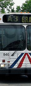 | St. Albert Transit 1993 built NewFlyer D40LF #846 (retired in late 2007), the type of bus this side sign was designed for, is seen at the Village/Transfer Center just off of Grange Drive on Jule 11, 2007. (Photo by Luke Olszewski from the website www.busdrawings.com operated by Peter McLaughlin. Used with permission.) |