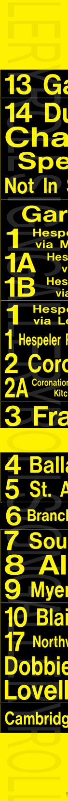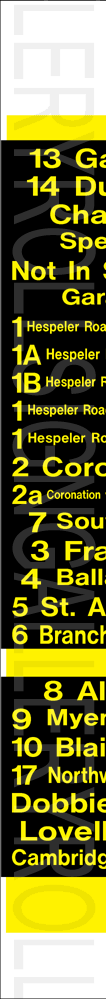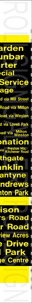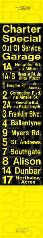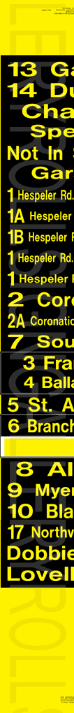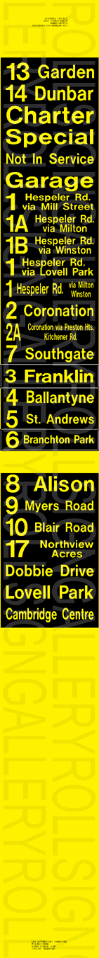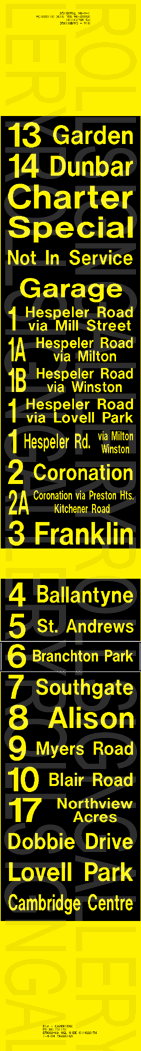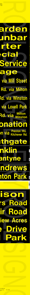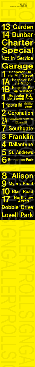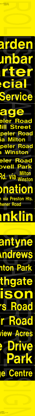 A general note about these rollsigns: All exposures are black with yellow print "N1" exposures use yellow mylar -- "N2" exposures use white mylar with yellow colouring for the character space