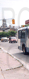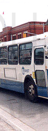| Cobourg Transit #21-89, one of two buses to have this style of sign, is shown westbound on King Street West at Ball Street on June 28, 1995. The other bus to have this style of sign was sister coach, Orion I #22-89 |