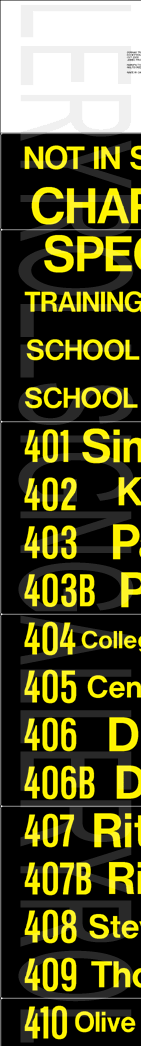 | This set of rollsigns was designed for one of the former Oshawa Transit Orion V buses. The jumbo front sign (left) would have been from one of their four 1991 built Orion V buses, where the side sign (right) could have come from either the four 1990 built Orion V buses or the 1991 built ones as well. The newer 1992 model former Oshawa Orion V buses were retrofitted with Luminator Horizon LED signs. Overall, those model buses were the only ones that had rollsigns in the DRT fleet. All others had some form of electronic sign. As a result, other than a standard 53 inch wide front sign, these were the only version rollsigns printed for the entire DRT system. Both signs have a print date of October, 2008, and they each have 34 exposures. Their respective sign tags and a photo are shown below. |