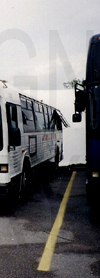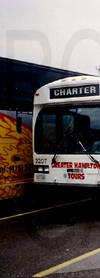 | Greater Hamilton Tours suburban MCI Classic #2206 (on the right, showing the sign featured, above) is seen with sister coach #2207 at Casino Rama, near Orillia, Ontario on Sept. 13, 2000. |