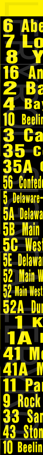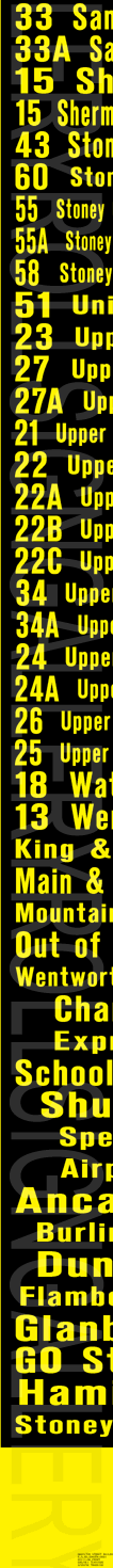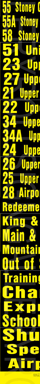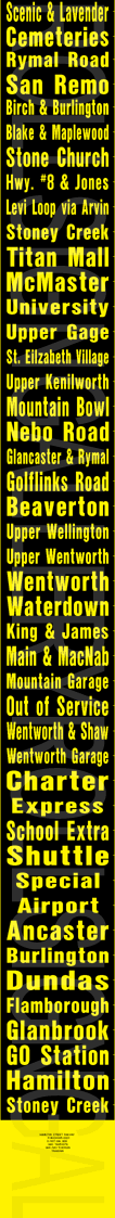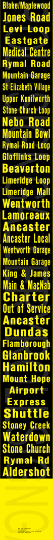 | This jumbo size front route mylar was received in mint condition. It was designed for one of Hamilton's 1989 built Orion V diesel buses, or 1991 built Orion V diesel and CNG buses. Unlike the signs on the other buses which have 92 exposures, this one only has 54 exposures. Some of the more obscure routes and some of the branch letter routes were left off of this one. Its print date is March 20, 2002. Its sign tag is shown below. |