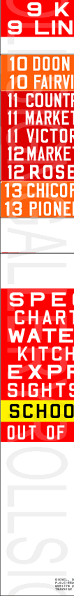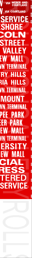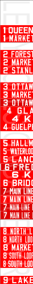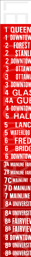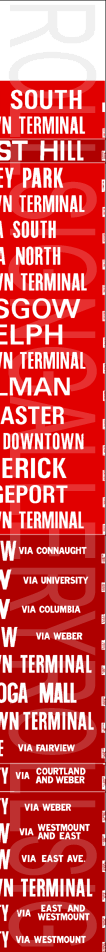 | This mylar front route sign is off 1974 built Flyer D800A #740. It has no print date. It has 60 exposures. This sign features some of the earlier update inserts that began to show on Kitchener Transit rollsigns. Still, about half the rollsign is original like the previous ones. This rollsign was donated to Rollsign Gallery by John McDonnell. |