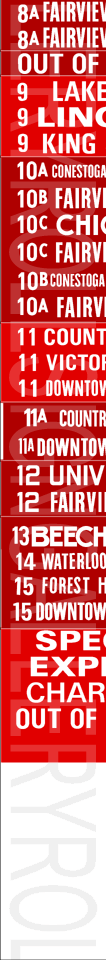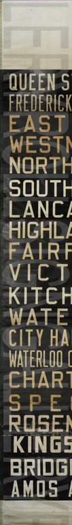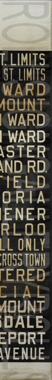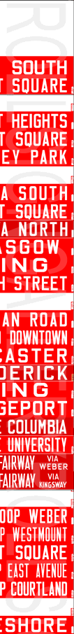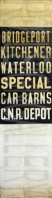 | This Kitchener Transit linen diesel bus rollsign is from the era when trolley coaches operated in Kitchener and Waterloo. The sign has no print date, but precedes all the mylar red print signs in the collection. The rollsign has 20 exposures, with the last four painted on at a later date from the original sign. This rollsign was donated to Rollsign Gallery by John McDonnell. |
