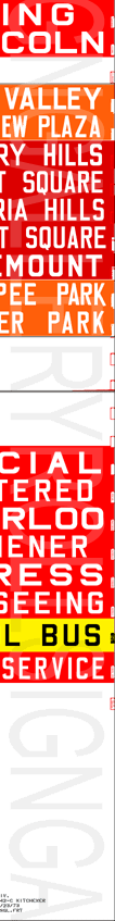 | This mylar front route sign is off 1968 GMC TDH-3502 #683. It has 54 exposures. It has no print date, but through research, have found it to have been printed sometime between 1980 & 1983. This sign shows some of the earliest inserted updates these would get over the years. As exposures were added and removed, these signs became quite a collage of changes. |