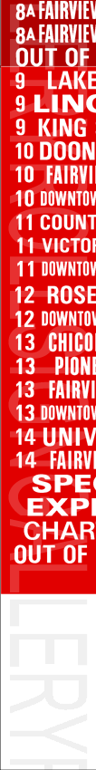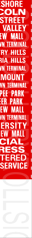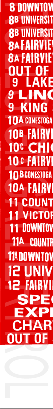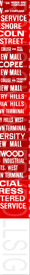 | This mylar front route sign is the original print from the late 1970s or early 1980s. As time went on, inserts were printed and added or substituted in as routes were created or changed. This original sign has 49 exposures. This rollsign was donated to Rollsign Gallery by John McDonnell. |