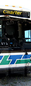 | London Transit 1998 built OBI 02.501 Orion II #11, the bus that housed the front rollsign set seen above, is seen retired and stored at a refurbishing yard near Windsor, Ontario on June 30, 2010. |