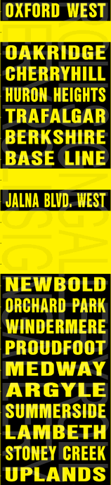 | The researched changes that identified these signs as being from September 4, 1994 include the introduction of route 24 Base Line and route 35 Argyle, and the split and routing change of 13 / 13A Wellington Road at this route's south end. |