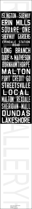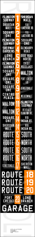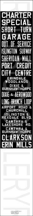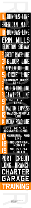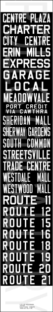 | Transit in Mississauga was originally operated by the Toronto and York Railway. Service began in 1905, operating interurban railway cars between Port Credit and Toronto. During this run, a number of bus companies offered supplemental services in the area: From 1922 to 1927, the competing bus lines of the Lake Shore Motor Bus Company and White Star Transit Company operated service to the Toronto and York Railway Mimico division, and Red Bus Lines operated parallel service between Toronto and Port Credit until 1928, when Gray Coach Lines took over the service. In 1935, the Toronto Transportation Commission operated bus service between the Long Branch terminal in southwest Etobicoke to a bus loop just west of Hurontario St on the southeast corner of Lake Shore Rd. and Pine St. South in Port Credit. (A small car dealership occupies the land where the loop once existed.) In 1955, Arrow Bus Lines operated three buses over one route in Port Credit and Cooksville until the fall of 1968 when Charterways Transportation Ltd. took over the service. Meanwhile, Georgetown Transportation Company was contracted to operate one route in the Malton area. Mississauga Transit as it is known today began on September 2 1969, first operated by Charterways, then taken over by the City of Mississauga, when the city was incorporated in 1974. Mississauga Transit didn't pay much regard to their bus's side destination signs, as shown by the rather large variety of dates listed. All of these signs were acquired from a Hamilton, Ontario scrap yard over a very short period of time. |