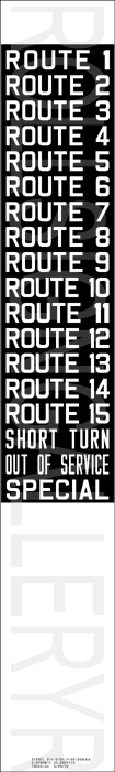 | This mylar side rollsign is off of 1977 built GMC T6H-5307N #2104. Its print date is April 18, 1977, making it likely this was the one and only side sign to occupy this vehicle. It has 25 exposures. At this time, Mississauga Transit's front signs had a similar layout to this side sign. The image of this sign has been drawn to scale, but has been enlarged slightly compared the signs to the left, to better show detail. Its sign tag is shown below. |