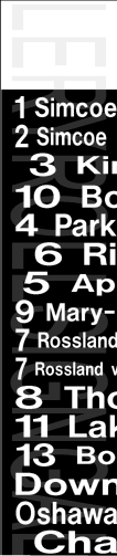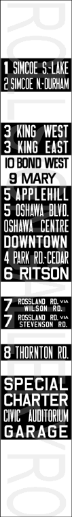 | This mylar side route sign was designed for a GMC New Look. Its print date is December 9, 1980. It has 25 exposures (including the blanks). "10 Bond West" has replaced "3 King West" and "9 Mary Nonquon" reading is now included. Its sign tag is shown below. |