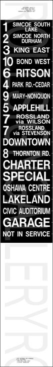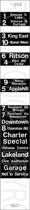 | This mylar side route sign was designed for one of Oshawa's Orion I buses. It is dated July 29, 1985 and has 25 exposures (including the blanks). Other than gap placement, the only changes are the periods removed from the route numbers, and exposure order of 6, 4, 9 and 5 and others on the sign. Its sign tag is shown below. |
