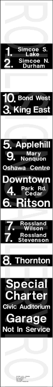 | This mylar side route sign was designed for one of Oshawa's MCI Classic bus. It is dated November 4, 1989 and has 25 exposures. Unlike most "modern" Oshawa rollsigns, this one uses all capital letters for the exposures. The white gaps are absent, but the order of the exposures remained the same. Its sign tag is shown below. |