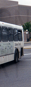Oshawa Transit 1992 built OBI 05.501 Orion V #138, displaying a jumbo front rollsign like the one shown above, is seen exiting the Oshawa Centre mall terminal on May 30, 1997.
