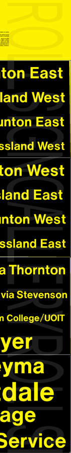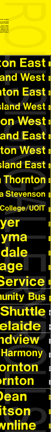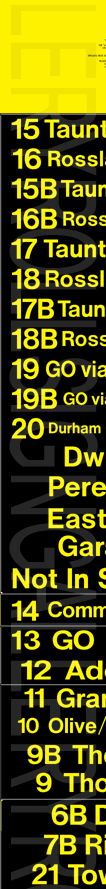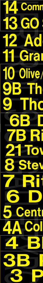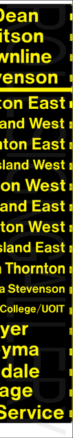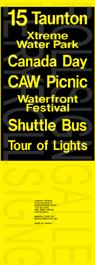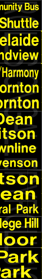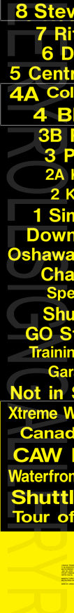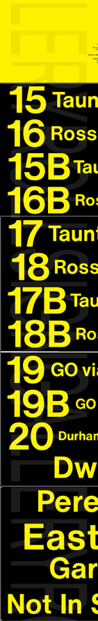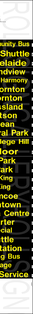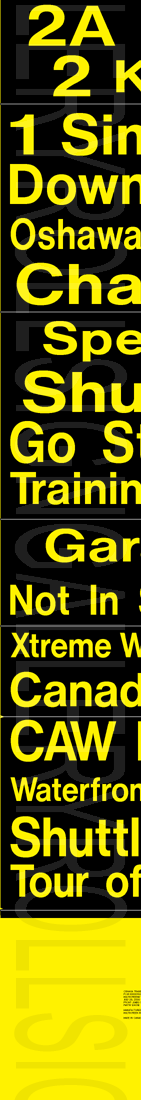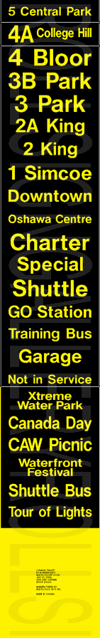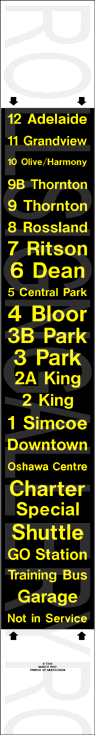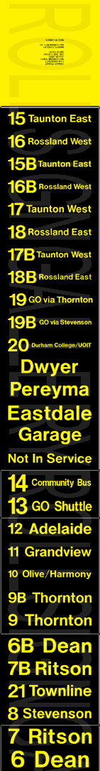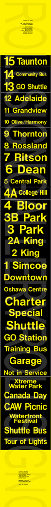 On November 29, 2004, Oshawa Transit had its final tag-on sign set printed to update their rollsigns. The upper section replaced the former "15 Taunton" exposure, added several new