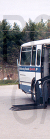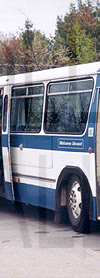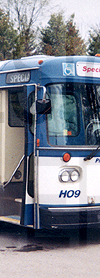 | Pickering Transit Specialized Services Orion I #H09, formerly regular service bus #912, is posed at the Pickering Transit yard while still in service on May 24, 1997. The side sign featured above can be seen in the side destination sign window, above the front door. |