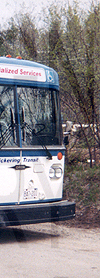 | Transit within Pickering began in May of 1967 with GO Transit operating fixed route service. Later, the Bay Ridges Dial-A-Bus, as a demonstration by the provincial government, began operations on July 6, 1970. This, combined with GO Transit's local fixed route service, reintroduced on February 28, 1972, held down service in Pickering until January 27, 1973, when the Pickering Dial-A-Bus, operated by the municipality, took over services within the city. Later, the modern Pickering Transit began offering its own fixed route service. Finally, on September 4, 2001 Pickering Transit merged with tis neighbouring system to the east, Ajax Transit, to create the Ajax-Pickering Transit Authority. APTA operated jointly until January 1, 2006, when it, along with Whitby Transit, Oshawa Transit, and Clarington Transit of Bowmanville, merged to become what is now Durham Region Transit. They continue to provide service to the City of Pickering to this date. |