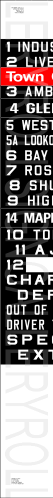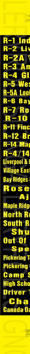 | This mylar front route sign is dated October 1995, and has 32 exposures. This version was the last to be printed before the creation of Ajax-Pickering Transit Authority. Its sign tag is shown below. |