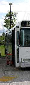 Sarnia Transit's 1992 built Orion V buses #921 and #923, showing jumbo front rollsigns from the same series as one above, are seen retired at the back of the Sarnia Transit garage on September 18, 2009. Orion V #922 was also on this retirement line but was not in a position to easily photograph from the front. |