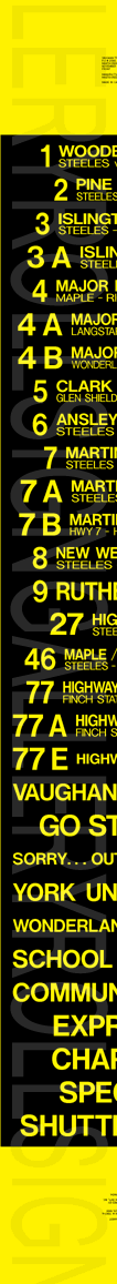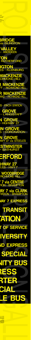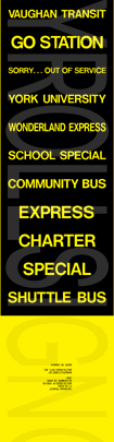 | This mylar front and side rollsign set is dated November 29, 1999. Each sign has 30 exposures. This series was the last to be printed under the Vaughan Transit name before it was amalgamated into York Region Transit. Their respective sign tags are shown below: |