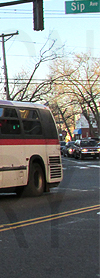 | A&C Bus Corp. RTS #1552 is seen turning northeast on Kennedy Blvd. at Sip Ave. on March 3, 2013. All buses operated by A&C are known for their solid red line on the side of the bus and the phrase "use the bus card on this bus" on the front of the bus. It's representative, but not the type of vehicle that used this rollsign. |