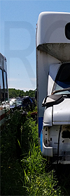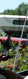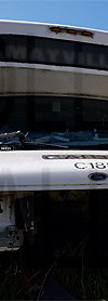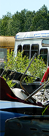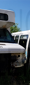 | Retired Chautauqua Area Regional Transit System Ford cutaway #C188, still displaying the rollsign to the left, is seen in a scrap yard in western New York state on June 19, 2020. (Photo by Peter Huffman. Used with permission.) |
