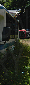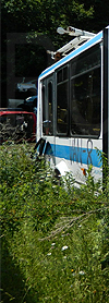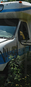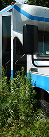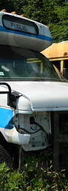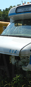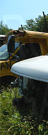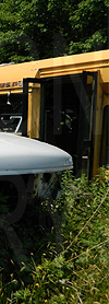 | In both these photos, retired Oswego County Opportunities 1990s era Ford / Starcraft cutaway #112, shown still displaying the rollsign seen here, is seen at a scrap yard in central New York state on June 22, 2020. (Both photos by Peter Huffman. Used with permission.) |