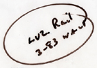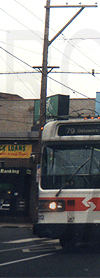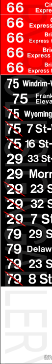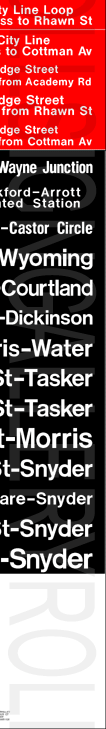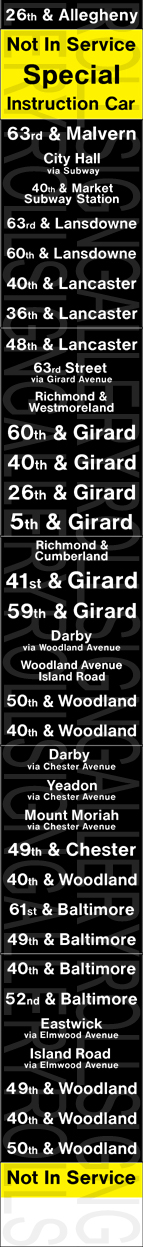 | This near complete set of rollsigns is from SEPTA's PCC streetcars (seen below). The front route number rollsign is missing from a full set. These were one of the last versions printed. Neither sign has a print date, but a hand written note on the side sign (left) dates it to March 1983, and is from Luzerne Rail (Carhouse). The side sign (left) has 19 exposures, while a complete front sign (right) would have 80 exposures. The image here was drawn virtually perfect to scale. The side sign's hand written note and a YouTube video of the side sign are seen below. |