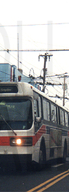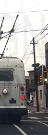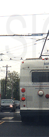 | Seen facing west, SEPTA trackless trolleys #812 (left) and #837 (right) are passing one another on Snyder Avenue at 23rd Street in South Philadelphia on May 4, 1999. The South Philadelphia trackless trolley routes no longer exist. These vehicles were the type that would have housed this style of rollsign. |